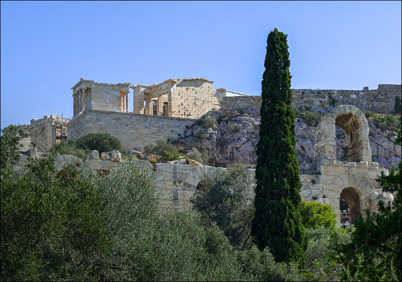 Pierwszy mijany obiekt już daje przedsmak dalszych atrakcji. Poniżej naszych stóp rozłożył się Odeon Heroda Attyka. Zbudowany został na południowo-zachodnim stoku Akropolu ateńskiego w 161 r. przez Heroda Attyka, który w ten sposób uczcił pamięć ukochanej małżonki, Aspasii Regilli. Odeon posiadał 32 rzędy widowni, gdzie mogło zasiąść od 5 do 6 tysięcy widzów. Wzniesiono go w stylu teatrów rzymskich. Scena o szerokości 35 metrów miała trzy kondygnacje. Okrągła orchestra o średnicy ok. 19 m wyłożona była szachownicą z białego i czarnego marmuru. Cały budynek, dla lepszej akustyki, przykryty był dachem z drewna cedrowego. W starożytności odbywały się w nim konkursy muzyczne i rozmaite przedstawienia.